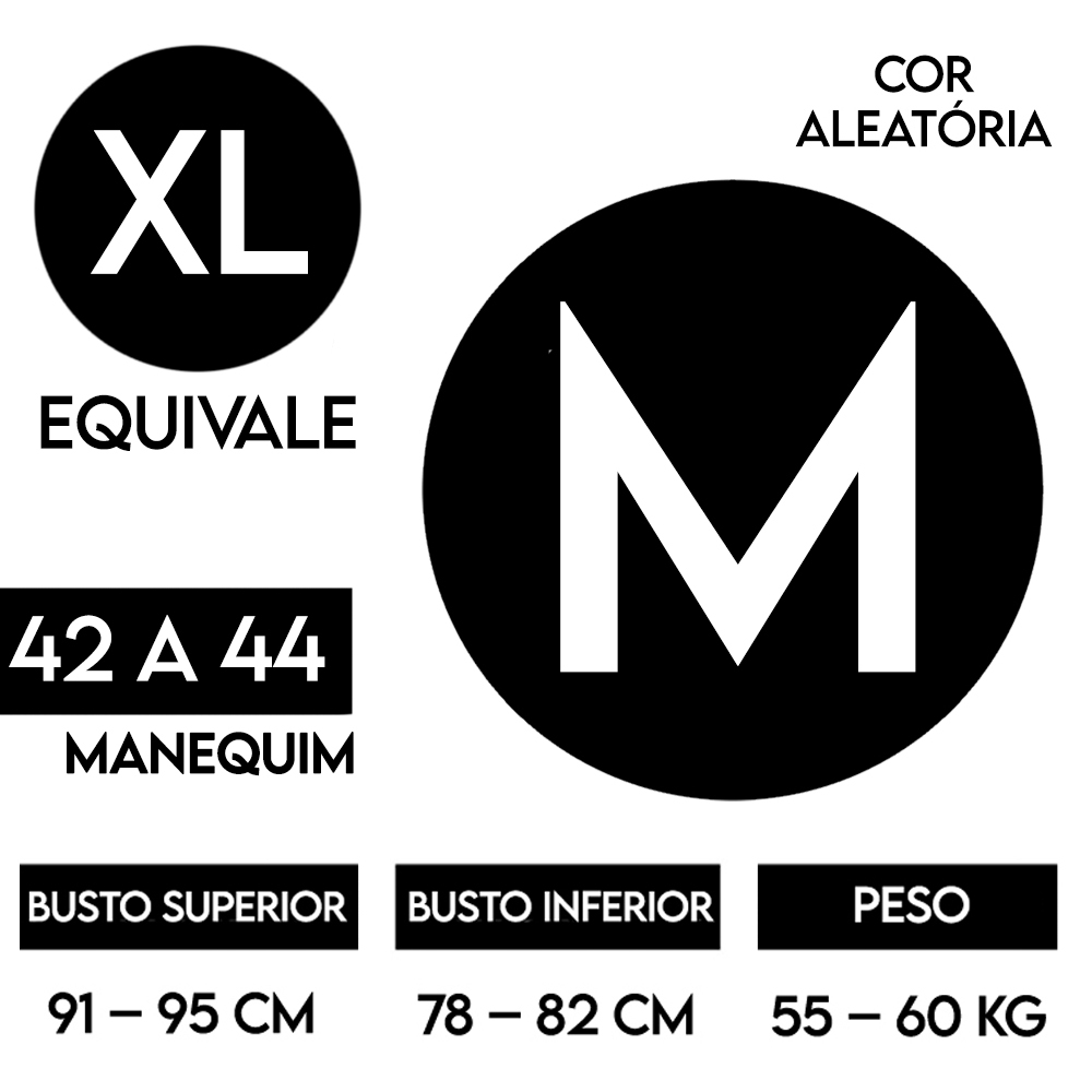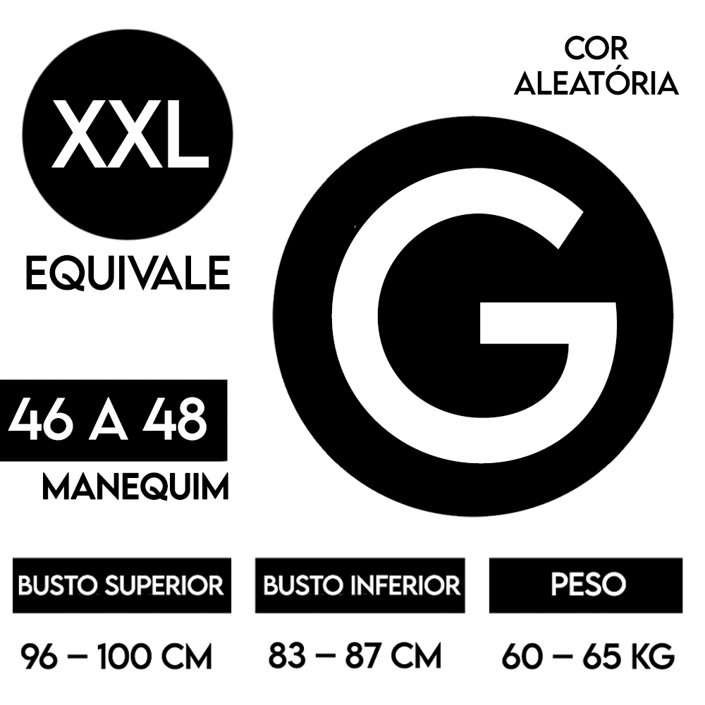 XG: Busto Superior: 96 a 100 cm | Busto Inferior: 83 a 87 cm | Peso: 60kg - 65kg